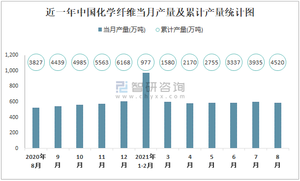 根據國家統計局數據顯示:2021年8月中國化學纖維產量為586萬噸,同比增長9.2%;2021年1-8月中國化學纖維累計產量為4519.6萬噸,累計增長15.6%;2015-2020年中國化學纖維產量總體呈現上升趨勢,2020年達到最高。