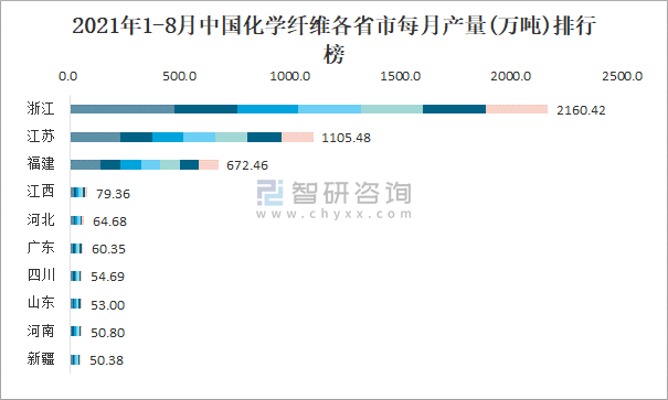 2021年1-8月中國化學纖維各省市每月產量排行榜