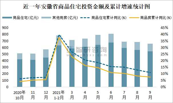 根據國家統計局數據統計可知:2021年9月安徽省房地產開發投資商品房投資金額為658.51億元(其中商品住宅為542.09億元,辦公樓、商業營業用房等其他用房116.42億元);2021年1-9月安徽省房地產開發投資商品住宅累計投資金額為4841.42億元,投資金額累計同比增長11.1%。