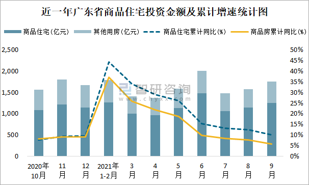根據國家統計局數據統計可知:2021年9月廣東省房地產開發投資商品房投資金額為1752.57億元(其中商品住宅為1250.93億元,辦公樓、商業營業用房等其他用房501.64億元);2021年1-9月廣東省房地產開發投資商品住宅累計投資金額為9314.61億元,投資金額累計同比增長10.1%。