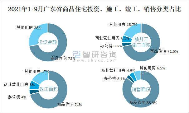 2021年1-9月廣東省商品住宅投資、施工、竣工、銷售分類占比