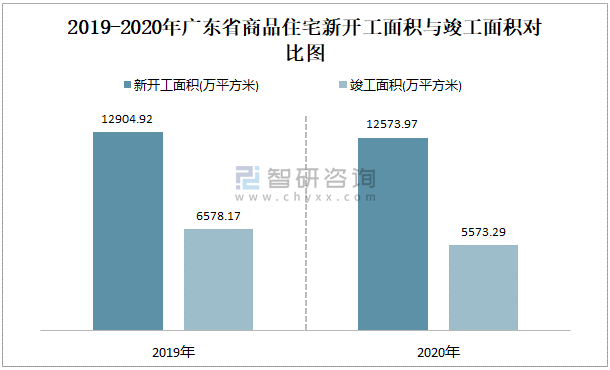 2019-2020年廣東省商品住宅新開工面積與竣工面積對比圖