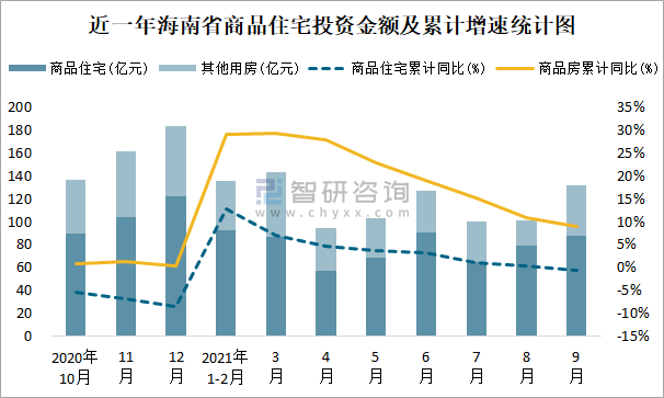 根據(jù)國(guó)家統(tǒng)計(jì)局?jǐn)?shù)據(jù)統(tǒng)計(jì)可知:2021年9月海南省房地產(chǎn)開(kāi)發(fā)投資商品房投資金額為131.81億元(其中商品住宅為87.91億元,辦公樓、商業(yè)營(yíng)業(yè)用房等其他用房43.9億元);2021年1-9月海南省房地產(chǎn)開(kāi)發(fā)投資商品住宅累計(jì)投資金額為627.02億元,投資金額累計(jì)同比下降0.6%。
