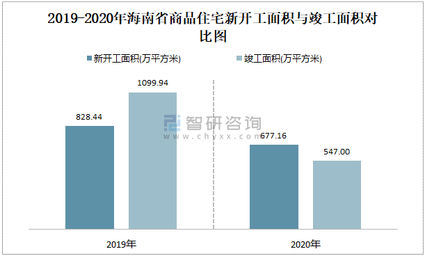 2019-2020年海南省商品住宅新開(kāi)工面積與竣工面積對(duì)比圖