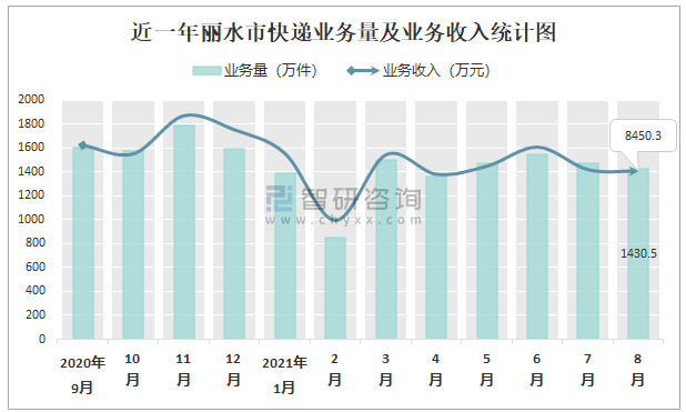 近一年麗水市快遞業務量及業務收入統計圖