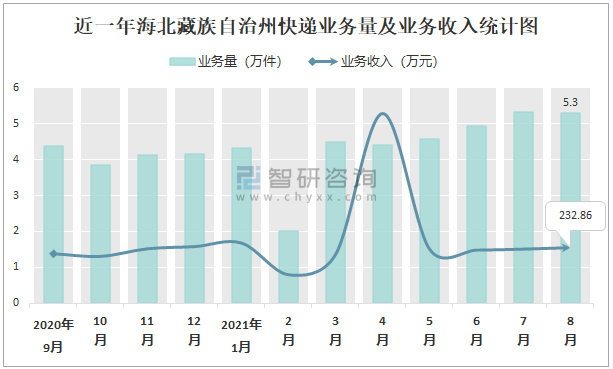 近一年海北藏族自治州快遞業務量及業務收入統計圖