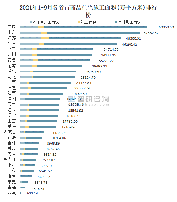 2021年1-9月各省市商品住宅施工面積(萬平方米)排行榜