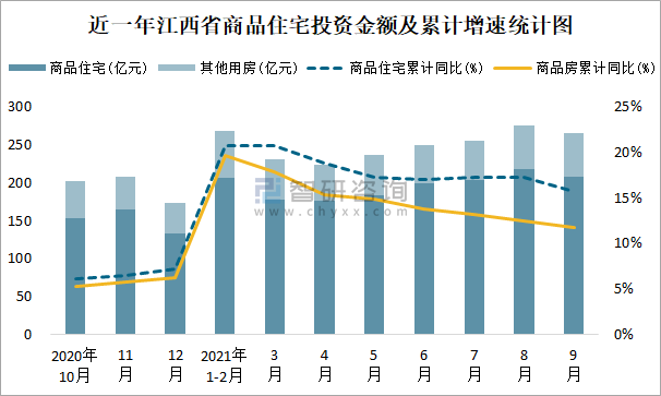 根據(jù)國家統(tǒng)計(jì)局?jǐn)?shù)據(jù)統(tǒng)計(jì)可知:2021年9月江西省房地產(chǎn)開發(fā)投資商品房投資金額為265.89億元(其中商品住宅為207.45億元,辦公樓、商業(yè)營業(yè)用房等其他用房58.44億元);2021年1-9月江西省房地產(chǎn)開發(fā)投資商品住宅累計(jì)投資金額為1572.77億元,投資金額累計(jì)同比增長15.7%。