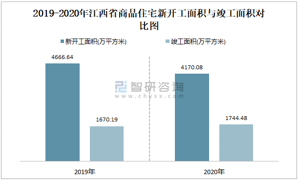 2019-2020年江西省商品住宅新開工面積與竣工面積對(duì)比圖