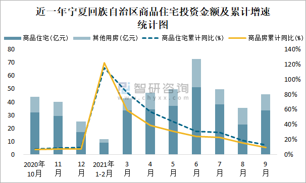 根據國家統計局數據統計可知:2021年9月寧夏回族自治區房地產開發投資商品房投資金額為45.85億元(其中商品住宅為33.4億元,辦公樓、商業營業用房等其他用房12.45億元);2021年1-9月寧夏回族自治區房地產開發投資商品住宅累計投資金額為259.65億元,投資金額累計同比增長12.7%。
