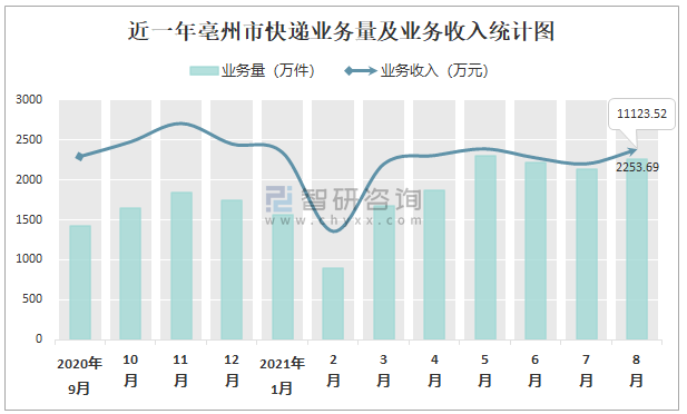 近一年亳州市快遞業務量及業務收入統計圖