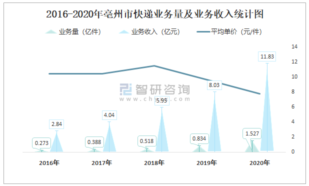 2016-2020年亳州市快遞業務量及業務收入統計圖