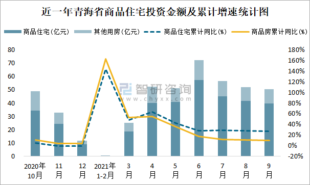 根據國家統計局數據統計可知:2021年9月青海省房地產開發投資商品房投資金額為50.36億元(其中商品住宅為39.81億元,辦公樓、商業營業用房等其他用房10.55億元);2021年1-9月青海省房地產開發投資商品住宅累計投資金額為284.2億元,投資金額累計同比增長26.7%。