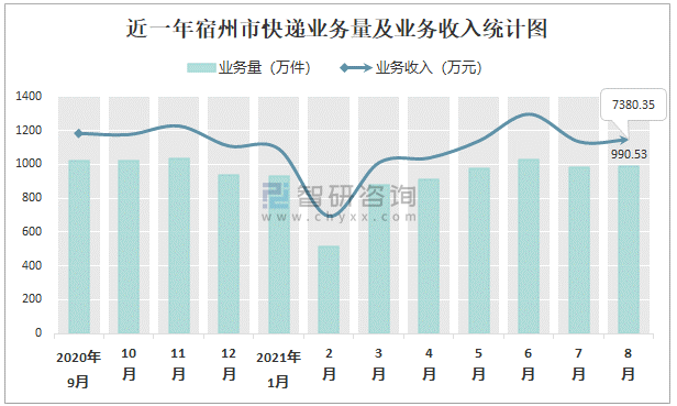 近一年宿州市快遞業務量及業務收入統計圖
