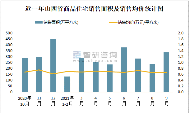 近一年山西省商品住宅銷售面積及銷售均價統(tǒng)計圖
