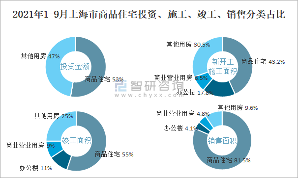 2021年1-9月上海市商品住宅投資、施工、竣工、銷售分類占比