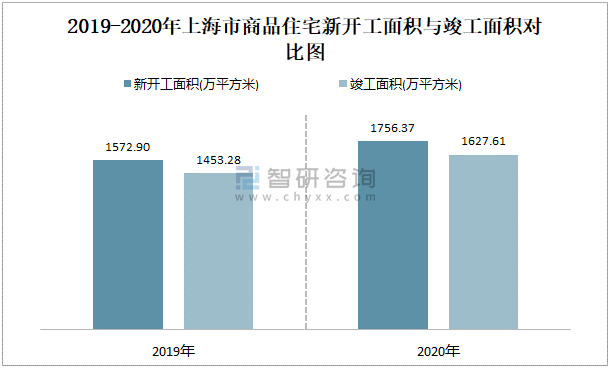 2019-2020年上海市商品住宅新開工面積與竣工面積對比圖