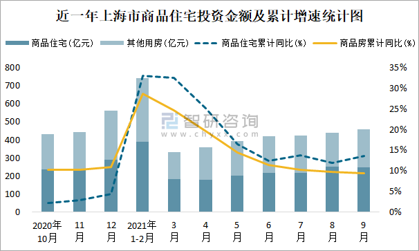 根據國家統計局數據統計可知:2021年9月上海市房地產開發投資商品房投資金額為460.05億元(其中商品住宅為245.73億元,辦公樓、商業營業用房等其他用房214.32億元);2021年1-9月上海市房地產開發投資商品住宅累計投資金額為1881.73億元,投資金額累計同比增長13.6%。