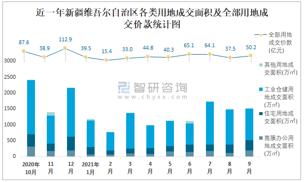 近一年新疆維吾爾自治區各類用地成交面積及全部用地成交價款統計圖