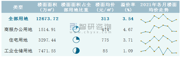 根據國信房地產信息網數據統計可知:2021年9月新疆維吾爾自治區全部用地出讓地面均價為352元/㎡,其中住宅用地出讓地面均價最高(1237元/㎡),全部用地成交地面均價為332元/㎡,其中住宅用地成交地面均價為1062元/㎡,高于商服辦公用地成交地面均價;2021年1-9月新疆維吾爾自治區工業倉儲用地樓面面積占其全部用地比重最多,為58.95%,溢價率為1.09%。