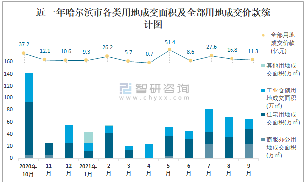 近一年哈爾濱市各類用地成交面積及全部用地成交價(jià)款統(tǒng)計(jì)圖