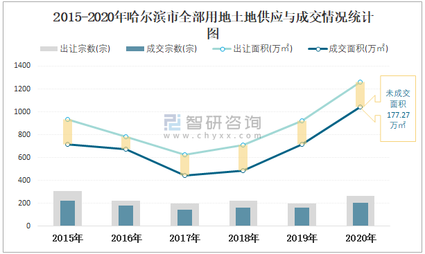 2015-2020年哈爾濱市全部用地土地供應(yīng)與成交情況統(tǒng)計(jì)圖