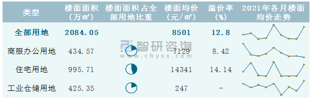 根據(jù)國(guó)信房地產(chǎn)信息網(wǎng)數(shù)據(jù)統(tǒng)計(jì)可知:2021年9月南京市全部用地出讓地面均價(jià)為21494元/㎡,其中住宅用地出讓地面均價(jià)最高(28387元/㎡),全部用地成交地面均價(jià)為26246元/㎡,其中住宅用地成交地面均價(jià)為33184元/㎡,高于商服辦公用地成交地面均價(jià);2021年1-9月南京市住宅用地樓面面積占其全部用地比重最多,為47.78%,溢價(jià)率為14.14%。