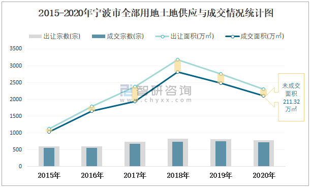 2015-2020年寧波市全部用地土地供應(yīng)與成交情況統(tǒng)計(jì)圖