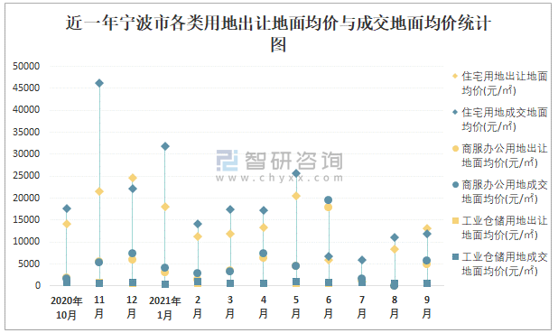 近一年寧波市各類用地出讓地面均價(jià)與成交地面均價(jià)統(tǒng)計(jì)圖