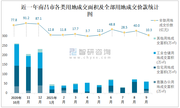 近一年南昌市各類用地成交面積及全部用地成交價款統計圖