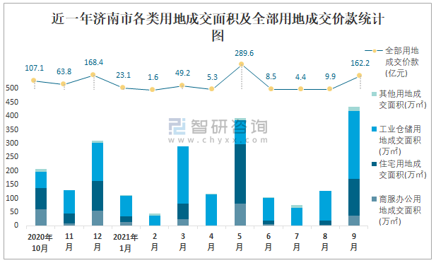 近一年濟南市各類用地成交面積及全部用地成交價款統(tǒng)計圖
