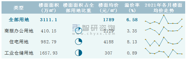 根據(jù)國信房地產(chǎn)信息網(wǎng)數(shù)據(jù)統(tǒng)計可知:2021年9月濟南市全部用地出讓地面均價為3679元/㎡,其中住宅用地出讓地面均價最高(8808元/㎡),全部用地成交地面均價為3743元/㎡,其中住宅用地成交地面均價為9180元/㎡,高于商服辦公用地成交地面均價;2021年1-9月濟南市工業(yè)倉儲用地樓面面積占其全部用地比重最多,為53.29%,溢價率為0.89%。