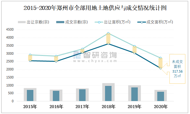 2015-2020年鄭州市全部用地土地供應與成交情況統計圖