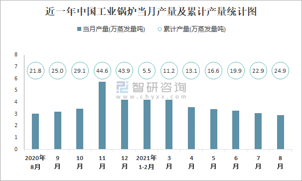 近一年中國工業鍋爐當月產量及累計產量統計圖