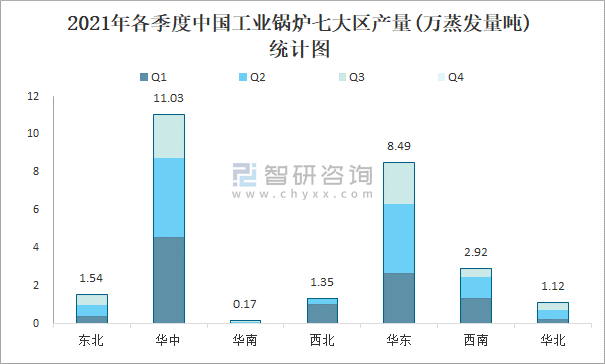 2021年各季度中國工業鍋爐七大區產量統計圖