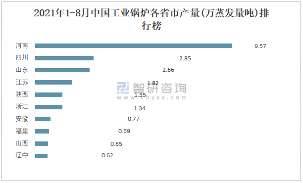 根據國家統計局數據顯示:2021年各季度(第三季度目前暫只統計7月和8月數據)中國工業鍋爐主要集中在華中、華東、西南地區生產;2021年1-8月中國工業鍋爐產量大區分布不均衡,其中華中地區產量最高,特別是河南省貢獻了最多產量;2021年1-8月中國工業鍋爐各省市產量top1遙遙領先于其他前9名。