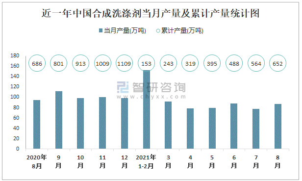 近一年中國合成洗滌劑當月產量及累計產量統計圖