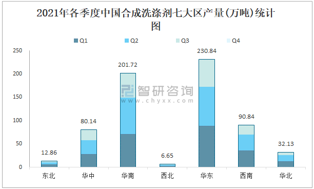 2021年各季度中國合成洗滌劑七大區產量統計圖
