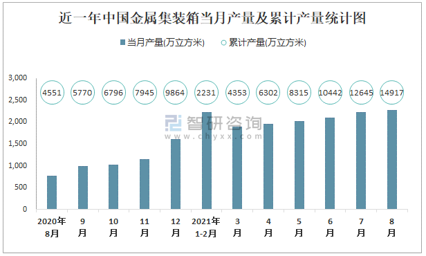 根據(jù)國家統(tǒng)計局數(shù)據(jù)顯示:2021年8月中國金屬集裝箱產(chǎn)量為2274萬立方米,同比增長137.8%;2021年1-8月中國金屬集裝箱累計產(chǎn)量為14917.2萬立方米,累計增長170.2%;2015-2020年中國金屬集裝箱產(chǎn)量2019年跌至最低值,次年有所回升。