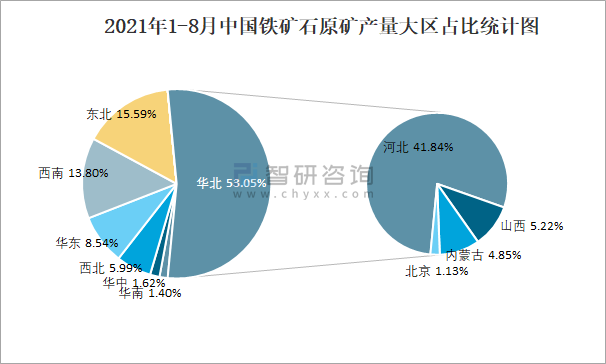 2021年1-8月中國鐵礦石原礦產量大區占比統計圖