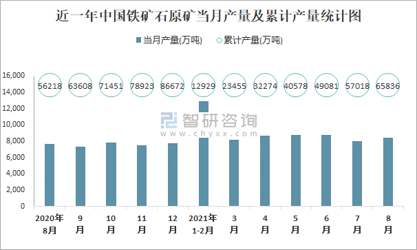 根據國家統計局數據顯示:2021年8月中國鐵礦石原礦產量為8392萬噸,同比增長5.6%;2021年1-8月中國鐵礦石原礦累計產量為65836.2萬噸,累計增長14.2%;2015-2020年中國鐵礦石原礦產量2018年跌至最低,此后逐年遞增。