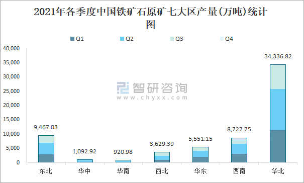 2021年各季度中國鐵礦石原礦七大區產量統計圖