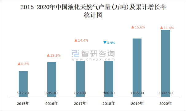 2015-2020年中國液化天然氣產(chǎn)量及累計增長率統(tǒng)計圖