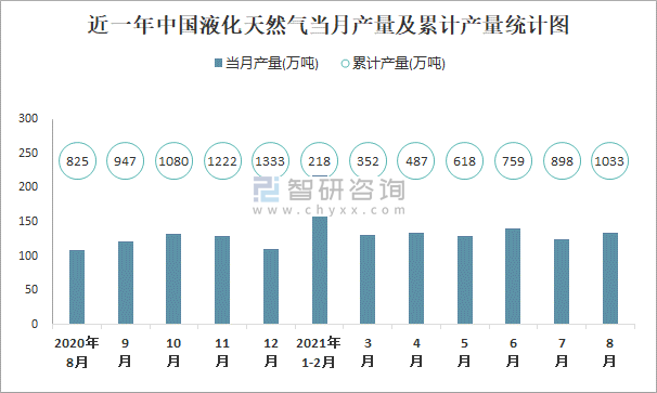 近一年中國液化天然氣當(dāng)月產(chǎn)量及累計產(chǎn)量統(tǒng)計圖