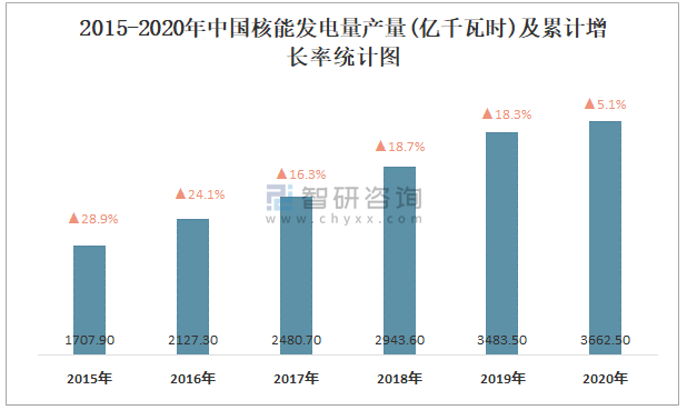 2015-2020年中國核能發電量產量及累計增長率統計圖