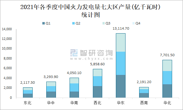 2021年各季度中國火力發(fā)電量七大區(qū)產量統(tǒng)計圖