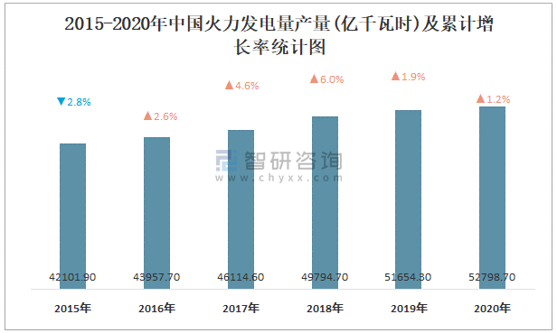 2015-2020年中國火力發(fā)電量產量及累計增長率統(tǒng)計圖