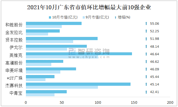 2021年10月廣東省市值環(huán)比增幅最大前10強(qiáng)企業(yè)