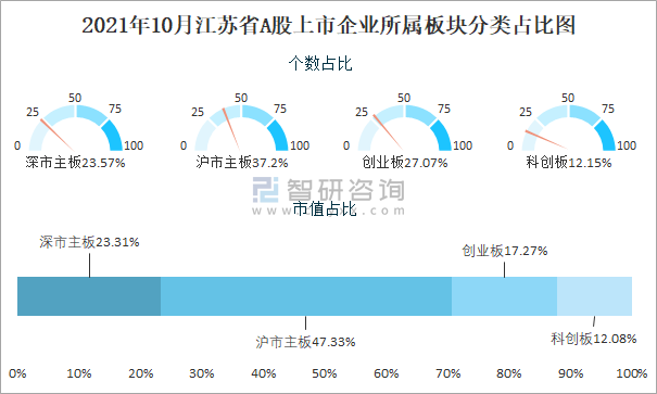 2021年10月江蘇省A股上市企業所屬板塊分類占比圖