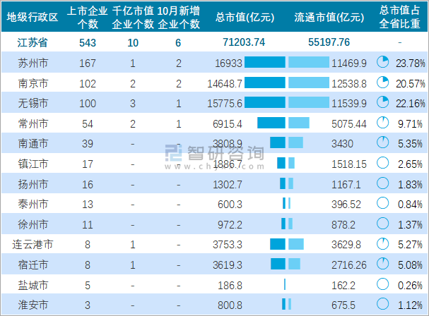 據同花順統計數據可知:10月江蘇省有6家企業新上市,截止至2021年10月31日,江蘇省的A股上市企業共計543家,上市企業數量排名全國第3,總市值共計71203.74億元;江蘇省下轄的13個地級行政區均有企業在A股上市,其中蘇州市上市企業數量最多,為167家;江蘇省的A股上市千億市值企業數量在全國排名第4,共計10家,分布在蘇州市、無錫市、南京市、連云港市、常州市、宿遷市6個地區,其中無錫市千億市值企業最多,為3家;無錫市A股上市企業總市值最高,南京市A股上市企業總流通市值最高。